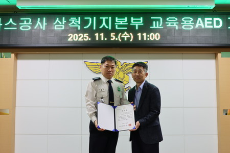 한국가스공사 삼척기지본부에서는 김종성 본부장을 비롯해 4명이 참석했다. 김 본부장은 교육용 자동심장충격기(AED) 10대를 기증했다. 소방서는 본부 측에 감사장을 전달했다.