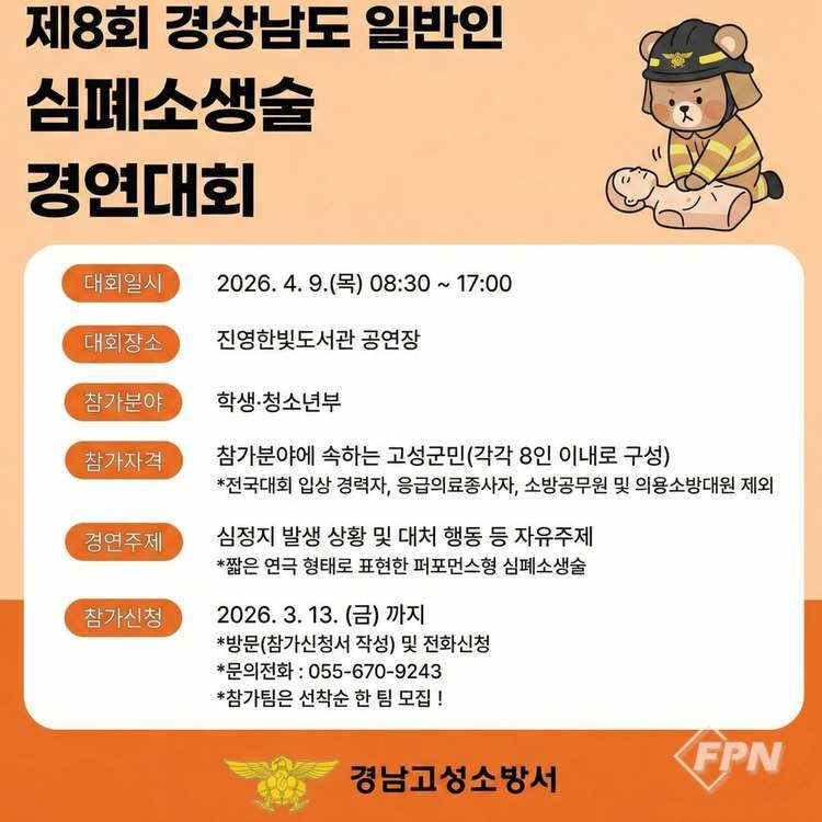 [FPN 정재우 기자] = 경남고성소방서(서장 전수진)는 ‘제8회 경남 일반인 심폐소생술 경연대회’ 참가팀을 모집한다고 3일 밝혔다.