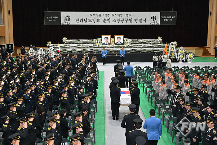 ![]() ▲ 전남 완도군 농어민문화체육센터에서 화재로 순직한 고 박승원 소방경과 노태영 소방교의 영결식이 엄수되고 있다. © 전남소방본부 제공 |