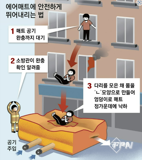 한편 소방서는 화재 현장에서 대피로가 막혀 불가피하게 에어매트로 뛰어내려야 할 경우 시민들의 2차 부상을 최소화하기 위한 ‘에어매트 안전하게 뛰어내리는 법’을 홍보하고 있다.