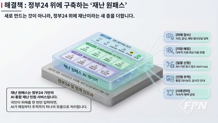 강 서장 등은 재난 피해자가 “가게가 침수됐어요” 등 말을 한 마디 하면 AI가 피해 상황을 분석해 다부처 지원제도를 자동으로 매칭ㆍ일괄 신청해주는 통합 플랫폼를 구축했다. 이 플랫폼을 적용하면 평균 6개 기관을 8회 방문해 14일이 소요되는 민원 접수를 약 7분 만에 서류 제출 없이 처리 가능하다.