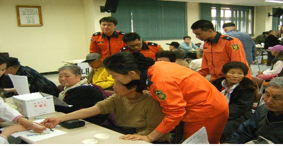 | ▲ 소방대원들과 경기도립의료진들이 무료건강진단을 하고 있는 모습 | 지난 20일 수원중부소방서(서장 박광순)는 관내 독거노인 , 국민기초생활수급권자등 57명을 선정하여 중부소방서 3층 강당에서 무료건강진단을 실시하였다. 수원중부소방서 2007년 역점시책으로 실버세대를 위한 무료건강진단 을 장안구 관내 기초생활수급자,독거노인등 57명을 선정하여 경기도립의료원과 함께 실시됐다. 중부소방서 3층 강당에서 내과진료, 안과진료등 7종의 건강진단을 실시된 검진은 검진결과 병변이 있는 사람에 대해 경기도립의료원에 대상자로 등록되어 무료로 외래진료, 중환자 입원치료등 전문치료를 받을 수 있도록 조치 하였다. 또한 건강진단 실시후 여성의용소방대원 10명이 무료 미용서비스를 실시하여 홀로사는 노인들에게 따뜻한 정을 전해주었다.