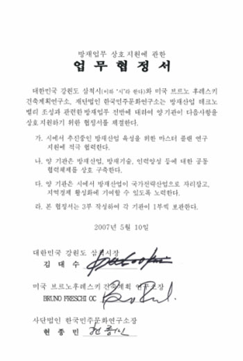 미국 기획건축 전문가인 브루노 후레스키는 삼척시의 방재산업테크노밸리 구축사업에 대한 중장기 발전전략과 삼척시 국제대학 타운 조성방안에 대한 로드맵을 제시하고 소방산업과 소방방재기술, 삼척의 미래도약을 위한 중장기 발전전략에 대해 청사진을 제시했다. 삼척시가 추진하고 있는 방재산업사업은 이번 업무협력 협정을 계기로 더욱 탄력 받을 것으로 기대된다. 또 삼척시는 외국방재기관 및 해외 방재기업체의 유치 전략 및 지원방안과 해외방재산업의 트렌드에 관해 오클라호마 대학 및 기획전문가와 용역을 체결하고 오는 8월까지 이를 수행한다. 결과물은 삼척시가 추진하는 방재산업의 중장기 계획에 실질적으로 반영됨으로써 방재산업이 국가 전략산업으로 뿌리 내릴 수 있도록 다양한 해외 네트워크와 정보 교류 망을 지속적으로 확대시켜 나갈 것으로 관측된다. 한편, 이날 행사는 (재)강원tp 방재산업사업단, 삼척시, 강원대학교 삼척캠퍼스 방재산업전문 인력양성 사업단이 주관하고 소방방재신문사 ,강원대 삼척캠퍼스 창업보육센터가 후원했다.