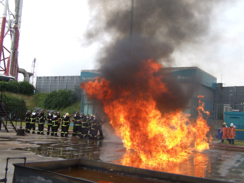 “앞으로” “앞으로” 복창을 하면서 보폭을 맞추어 한발 한발 다가서는 대원들의 눈에는 긴장감이 돈다. 매일 반복되는 업무가 화재진압이다. 불을 끄는데 누구보다도 베테랑이라 자부하는 소방관들이 기름불을 끄는데 전력을 하다고 있다. 일반화재와는 다른 기름화재를 끄기 위해서는 물이 나가는 호스에 높은 압력이 유지된다. 큰 반동력이 있기 때문에 몇몇 대원들의 힘으로 감당하기 힘이 든다. 30도를 웃도는 무더위, 신체를 보호하는 툭툭한 화재진압복장, 그리고 뜨거운 열기로 다가온 기름불앞에서 가감하게 한발 한발 앞으로 나가면서 외치는 힘찬 복창소리는 무더운 여름날씨를 서늘하게 만든다. gs칼텍스에 운영하고 있는 유류화재 진압훈련장에 여수소방서 소방관들이 교육생으로 훈련을 받고 있다. 위험한 화재진압 훈련이라 팀의 일체감이 중요하단다. 한사람의 순간 실수는 팀원의 전체에 치명적인 위험을 초래 할 수가 있어 더욱 긴장하지 않을 수 없다.