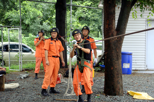 중점훈련내용으로는 계곡 및 하천 수평구조 훈련, 연장로프(횡단로프)설치법 및 티롤리안 도하법, 하천내 고립자 구명환 및 팽창식 구명동의 사용 요구조자 구출법, 각종 도르래, 확보기구, 로프매듭 숙달훈련으로, 최근 집중호우로 인한 비피해가 늘어남에 따라 재난대비에 만전을 기하고 있다.