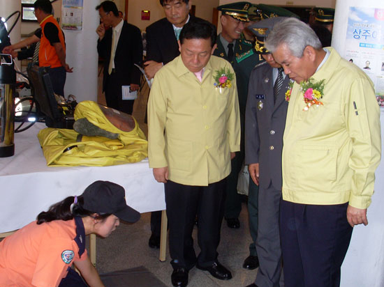 | ▶ 소방장비 설명을 듣고 있는 이정백 상주시장 © 김응군 객원기자 ◀ | | 상주소방서(서장 성상인)는 22일 상주문화회관에서 열린 민방위대 창설 제34주년 기념식에서 각종 재난 현장에서 사용되는 소방장비를 전시하고 설명하는 시간을 가졌다. 김응군 객원기자 fnokeg@gb.go.kr