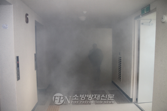 ![]() ▲ 제연설비가 설치된 공동주택에서 연기발생기를 이용한 테스트를 진행하고 있는 모습이다. © 최영 기자 |