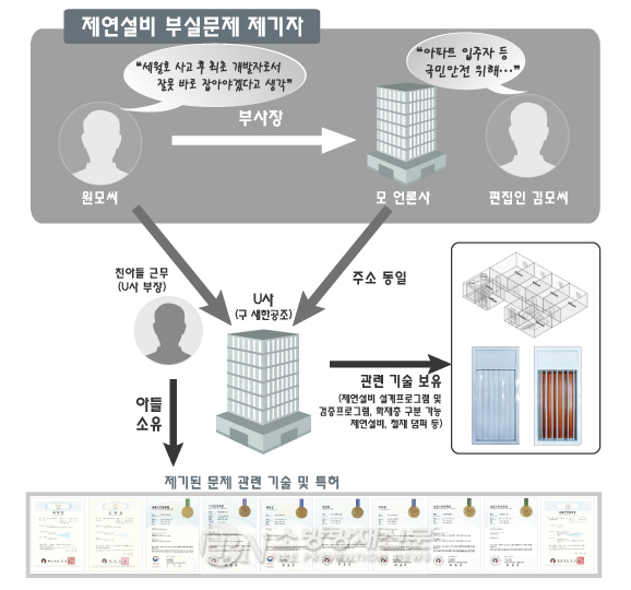 그러나 이 업체에서 일하는 원모 대표 아들 명함에는 ‘구 새한공조’(원 씨의 과거 회사)라는 글귀가 새겨져 있고 U사가 보유한 제연설비 관련 특허와 실용신안 등은 원모씨 아들의 소유인 것으로 확인됐다.