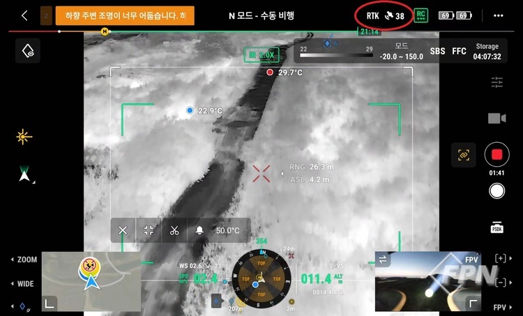 테스트 간 위성 수신개수를 확인한 결과 복잡한 도심의 경우 평균 약 20~30개, 장애물이 없는 외곽의 개활지에서는 31~38개 정도 수신되는 걸 확인했다. 수신개수는 비행 주변 환경에 따라 큰 차이가 있을 수 있다.