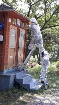 이날 출동한 소방대원은 말벌집이 공중 화장실 지붕 밑에 있다는 신고자의 말에 따라 사다리와 벌집수거 비닐을 이용해 안전하게 벌집을 제거하고 현장의 안전을 재차 확인한 후 귀서했다.