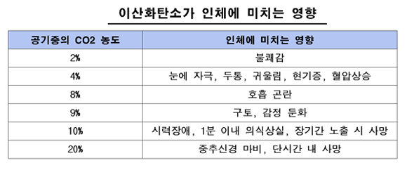 이처럼 소방시설을 관리하는 입장에서는 가스소화설비가 화재안전을 지켜주는 중요 시설이면서도 한편으로는 두려운 존재로 인식되고 있는 실정이다. 소화가스 방출로 인한 질식의 위험성 때문이다. 특히, 관리자 측면에서는 오동작이나 화재진화를 위한 가스 방출 시 현장 확인이 급선무이기 때문에 방호구역으로의 접근은 불가피한 게 현실이다. 하지만 방출공간에 함부로 접근했다가 가스소화약제를 들여 마시면 치명적인 사고로 이어질 수 있기 때문에 진입조차 어렵다고 관리자들은 말한다. 2008년 9월 13일 논산 금강대학교 강의동 지하 전기실에서 발생한 화재 사고는 이 같은 위험성을 쉽게 확인시켜 주고 있다. 전기실 내 변압기에서 화재가 발생하면서 이산화탄소 소화설비가 작동돼 불은 자체 진화됐지만 화재현장 복구를 위해 현장에 진입하던 관리자 두 명이 질식해 1명이 숨지고 1명이 중태에 빠졌다. 최초에는 1명이 방출구역에 접근했다가 질식으로 쓰러졌고 구조를 위해 접근한 또 한명의 관리자가 질식해 버린 사고이다. 지난 2001년 금호미술관 방출사고로 사람이 상시 근무하는 장소나 전시장 등에 이산화탄소 소화설비를 설치할 수 없도록 제도의 개선은 이뤄졌지만 관리자는 아직까지도 질식사고에 무방비로 노출돼 있는 실정이다. 이산화탄소설비 위험성은 더욱 치명적! 가스계소화설비 중 이산화탄소소화설비의 위험성은 타 청정가스소화약제와 비교가 안될 만큼 높다. 이산화탄소 소화설비는 공기 중 21%의 산소 함유량을 15%이하로 낮춰 연소물을 질식작용에 의해 소화시킨다.