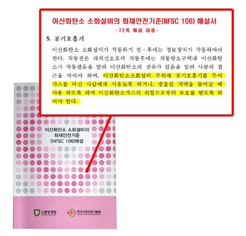미국 nfpa코드(nfpa 12, 12a, 2001)에 따르면 이산화탄소와 할론, 청정소화약제소화설비가 설치된 곳에 대한 훈련과 경고신호, 방출경보, 공기호흡기, 대피 계획 및 소방훈련 등과 같은 안전 관련 사항을 고려하도록 명시돼 있다. 특히, 이산화탄소소화설비의 경우 공기호흡기의 사용 및 착용에 대한 적절한 훈련을 받지 않으면 이산화탄소 농도가 4%를 초과하는 공간에 있어서는 안 된다고도 규정하고 있다. 공기호흡기를 통해 시설물 관리자가 오작동 및 작동 시 방호구역에 접근할 수 있도록 안전장치를 마련하고 훈련과 교육을 받도록 하고 있는 것이다. 관리자 안전 위한 ‘제도 개선 필요’