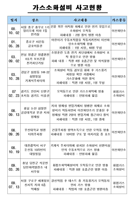 이 가스소화설비는 국민의 재산과 생명을 보호하기 위해 소방 관련법에서 강제적으로 설치 대상을 정하고 있지만 오히려 안전을 위협하는 시설로도 인식되고 있다. 지난해 국정감사에서 한나라당 원유철 의원은 이 같은 문제점을 지적하면서 근본적인 대책을 마련해야 한다고 지적하기도 했다. 본지에서는 화재안전을 위해 설치되는 가스소화설비가 무슨 이유로 위협적인 시설로 인식되는 것이며 또 어떤 사고가 발생되는지 집어보고 그 해결방안을 살펴보고자 한다. 잇따르는 질식사고… 정확한 집계는 불가능! 가스소화설비 중 이산화탄소 소화설비로 인한 질식사고는 지난 2001년 종로구 사간동에 위치한 금호미술관에서 발생한 사고가 가장 대표적인 사례이다. 관람 중인 어린이가 설비 수동 조작함을 작동시키면서 소화약제가 미술관 내부로 분출돼 어린이 1명이 사망하고 50여명이 부상을 입는 전례 없는 사고였다.