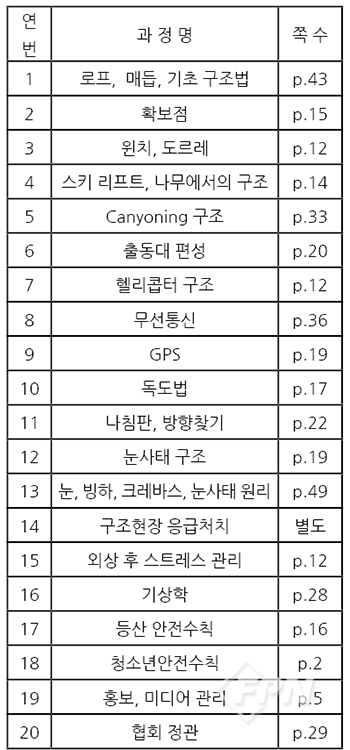 매뉴얼은 로프매듭, 독도법, 무전기 사용법 등 총 20개 과정[표1]402쪽으로 구성돼 산악구조에 필요한 실무 전반에 대한 지침이 실려 있다.