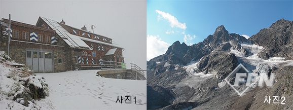 ▲ [사진1]사라뷔커(Saarbbrucker-Hutte) 산장, 100년의 역사를 자랑한다. / [사진2]산장에서 본 Grobes Seehorn(3121m)산의 Litzner 빙하지대