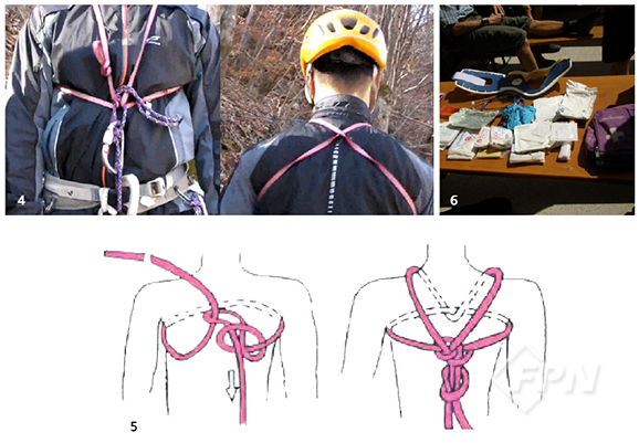 ▲ [사진4] 슬링을 이용한 임시 상단 안전벨트 [사진5] 보울라인 매듭을 이용한 임시 상단 안전벨트 [사진6] 기본 응급처치 세트