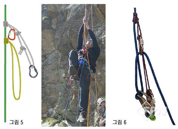 ▲ [그림5]프루직 등반시스템 / [그림6]오버행 극복을 위한 뮌히하우젠 등반시스템