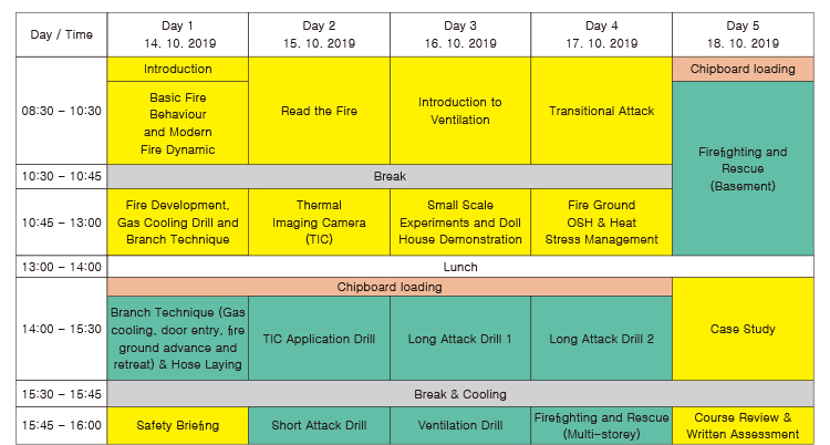 국제 소방관 과정은 원래 CFBT Senior Officer의 2주 과정으로 대한민국 팀장급 지휘자가 화재진압을 수행할 때 유용한 다양한 전술을 익히게 됩니다. 커리큘럼은 화재 성상과 관창 조작, 화재 읽기, 개인보호장비ㆍ열스트레스 관리, 열화상카메라 운용, 화재진압 전략, 배연, 사례연구, 평가 등으로 구성돼 있습니다. 이번 교육에서는 이 내용을 1주(5일)로 압축해 진행했습니다.