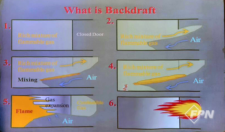 이 혼합이 일어나는 경계면은 공기 흐름에 따라 개구부 반대쪽으로 형성돼 미연소 가스를 압축 시켜 미연소 가스의 압력을 올립니다. 또 미연소 가스가 발화해 불꽃을 발하면 가스폭발(팽창)이 일어납니다. 이는 Fire ball이 개구부 쪽으로 발사되는 백드래프트 현상을 일으킵니다.