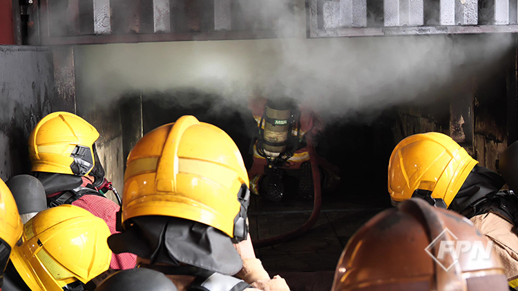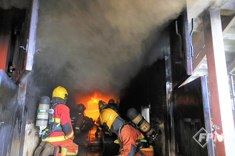 CFBT 훈련장은 19개의 40ft(약 12m) 화물 컨테이너로 구성된 3층 구조물입니다. 화재 구역은 총 네 곳으로 지상층에 설계돼 있습니다. 화재실에서는 탄소성 연료(칩보드, MDF 패널)로 화재 현상을 구현합니다.