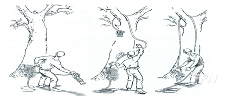 드로우 볼이 수목의 가지를 지나 미끄러져 내려올 때 로프를 묶고 반대편 드로우 라인을 당겨 올리면 수목의 높은 곳에 로프가 설치된다.