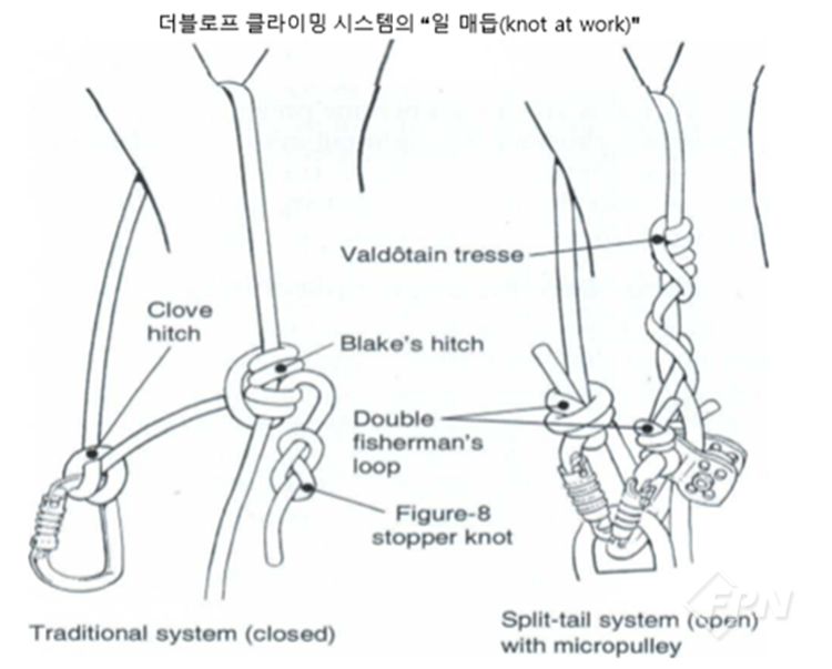 나열된 다른 두 가지 매듭조합은 각각 같은 순서와 방식으로 묶인다. 위의 매듭을 묶는 게 무척 번거롭지만 로프 설치 시 좌절(?)을 최소화하며 로프를 설치하고 싶다면 이는 매우 값진 경험이라고 할 수 있다.