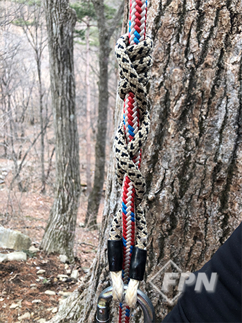 [사진 1]처럼 클로브 히치를 이용하면 카라비너에 묶고 고정하기가 빠르다. 하지만 스필드 테일 시스템에서 똑같은 매듭을 사용한다면 매듭이 미끄러지고 로프가 통과할 수 있어 꼬리가 당겨져 매듭이 풀어질 수 있다. 이 때문에 터미네이션 넛트로 클로브 히치를 사용한다.