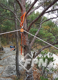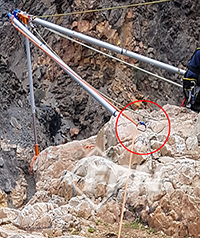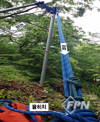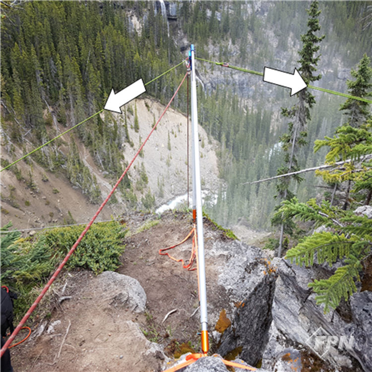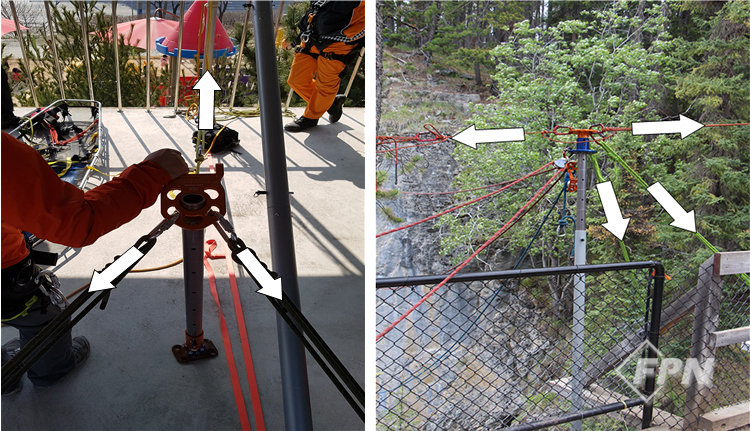 1) 가이라인 역할 ㆍ조절 기능 : 싱글 로프로 모노ㆍ바이 포드의 머리에 연결돼 압축 다리 위치를 잡고 경사를 조절한다. 보통 조절 가이라인은 하나의 8㎜ 프루직 또는 이와 유사한 것으로 고정된다. ㆍ장력 기능 : 조절 기능의 반대 방향으로 비작동 도르래 시스템(카라비너만 사용)으로 모노ㆍ바이 포드에 장력을 가하는 데 사용된다. ㆍ모든 가이라인은 뮬 히치로 추가 고정된다.