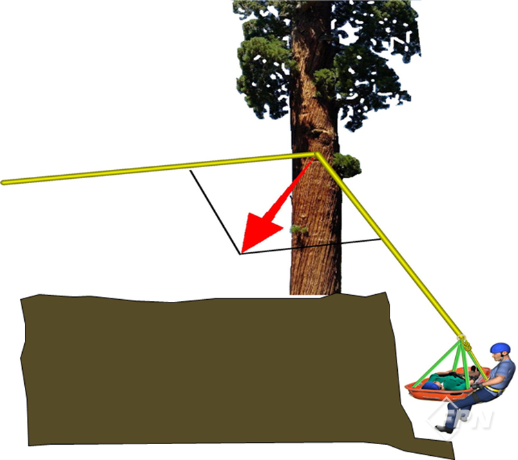 위 그림에서 각도는 대략 120°이므로 실질적인 합력은 두 구성 요소와 각각 같다. 질량이 200㎏이라면 합력도 같다. 합력(붉은 화살)은 나무 왼쪽으로 기울어져 가장자리(오른쪽)가 아닌 왼쪽으로 나무를 잡아당기고 있다. 이는 많은 구조대원에게 높은 방향 지점을 사용하는 것에 대한 의문점을 준다.