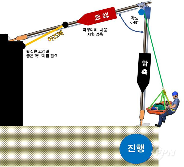 설치된 AHD 아래 가장자리 너머로 구조대원과 요구조자 등 장비를 안전하게 이동시키려면 특별히 많은 부분을 준비해야 한다.
