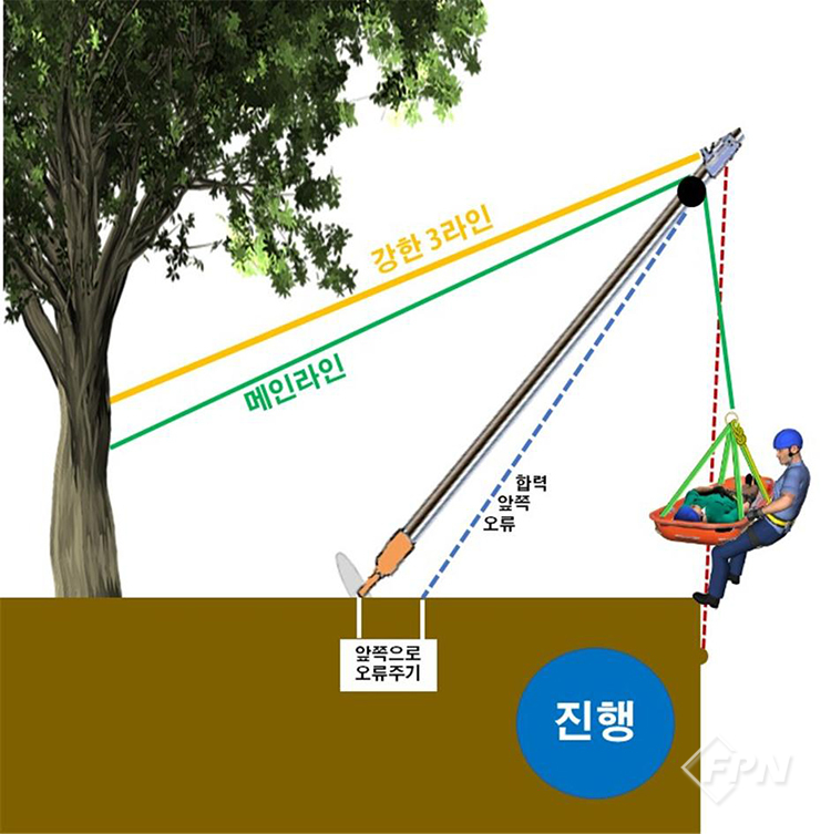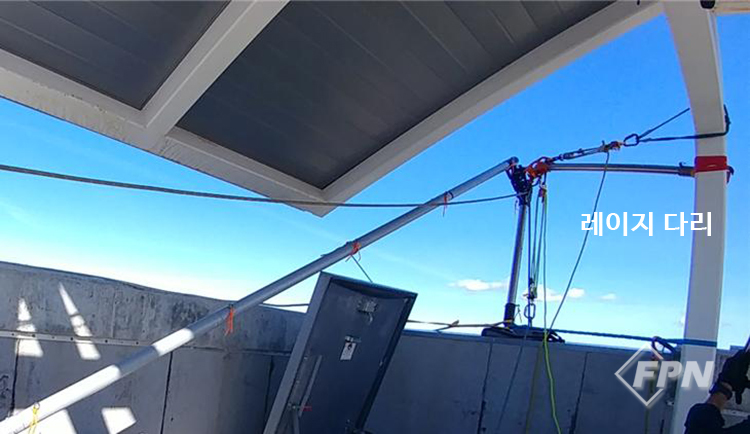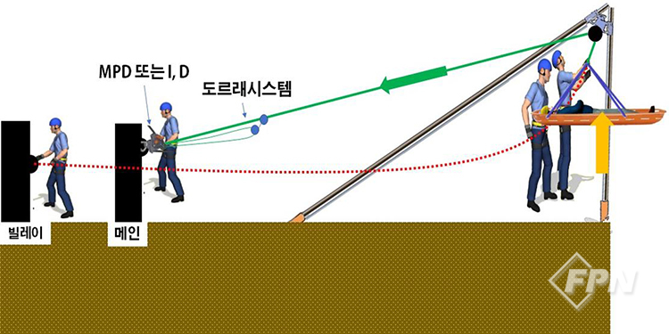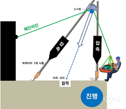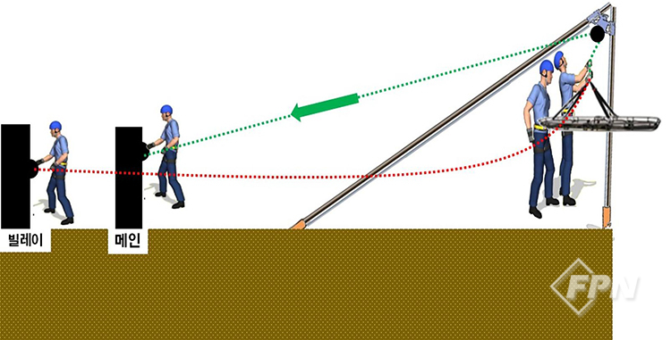 6) 모든 준비가 확인되면 구조대원은 시스템에 사전 장력 테스트를 한다. 이상이 없으면 가장자리로 이동 후 다시 하중을 준다.