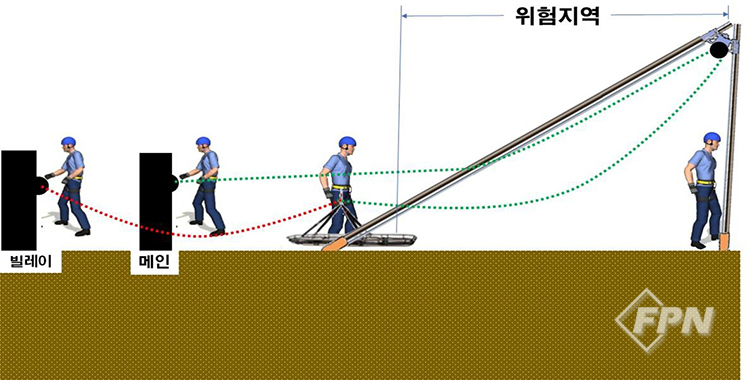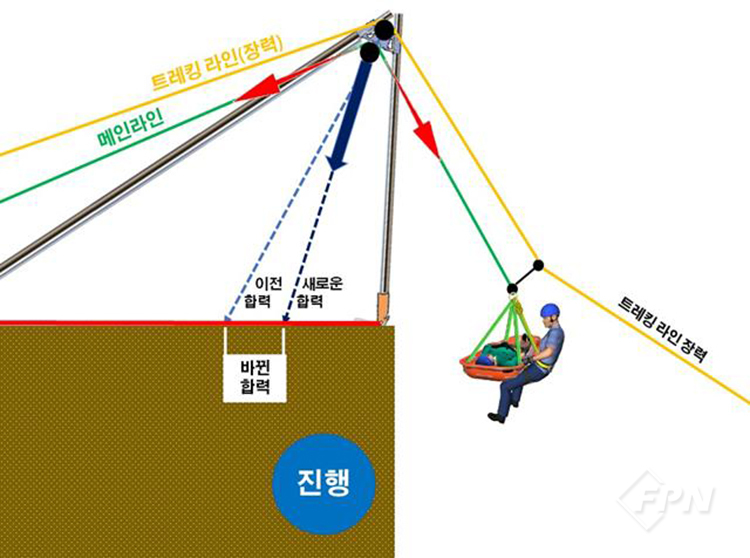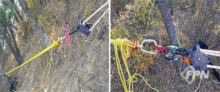 6) 모든 준비가 확인되면 구조대원은 안전한 지역에서 시스템 사전 장력 테스트를 한다. 이상이 없으면 가장자리로 이동 후 다시 하중을 준다.