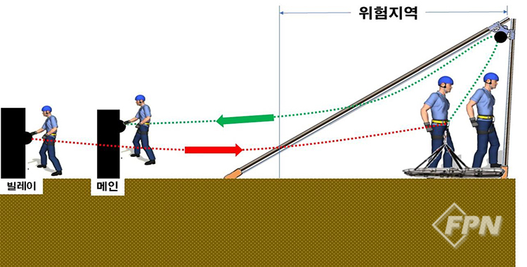 9. 합력 앞쪽으로 오류 주기(A 프레임ㆍ진 폴에서만 사용) A 프레임과 진 폴은 앞뒤로 가이라인이 배치돼 있다. 이 경우 조절 가이라인을 앞쪽 아래에 있는 확보지점에 설치하기 위해선 필요한 모든 수단(등반 또는 하강)을 동원해 확보지점으로 내려가야 한다.