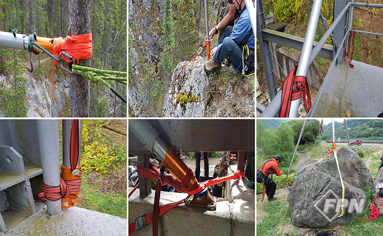 묶기나 말뚝, 확장 볼트, 캠 등의 조합으로 발과 다리를 박아 고정하는 건 지형 등의 이유로 묶어 고정하기 어려울 때 사용한다. 울퉁불퉁한 면에 설치돼 있거나 당기는 방향이 하중의 힘을 측면으로 이끌 땐 그 발이 불필요하게 들리거나 이동하는 걸 막도록 고정돼 있어야 한다. 얼마나 느슨한지, 충격하중이 휴대용 확보지점의 안정성에 얼마나 영향을 미칠지를 항상 예측해야 한다.