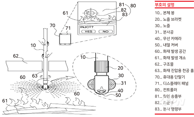 이때 분사공(31)을 통해 화재 진압 용수가 분사된다. 무선 카메라(40)는 노즐(30) 단부에 장착돼 실시간으로 화재 발생 공간(60) 내부의 화재 발생 상황을 전송한다. 무선 통신으로 조작할 수 있다.