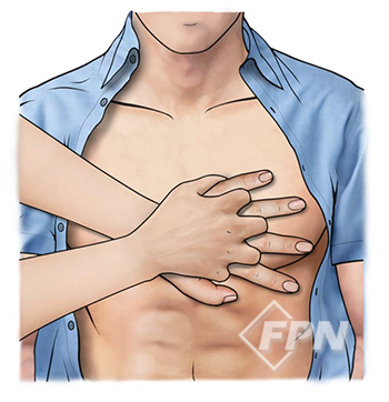 성인 심정지 환자에서 가슴 압박을 시행할 때 흉골의 하부 1/2 지점을 압박하는 걸 제안한다.