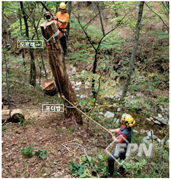 만약 나무의 ‘초두’라 불리는 곳이 기울어져 있다면 ‘당김줄(Pull Line)’을 설치해 지상 작업자와 합을 맞춰 안전하게 작업하면 된다.
