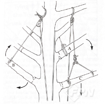 이는 잘린 나무의 회전을 줄일 수 있을뿐더러 물체가 떨어지면서 발생하는 ‘동적 하중(Dynamic loading)’을 줄일 수 있다. 짧은 길이의 로프를 이용해 ‘클로브 히치’와 ‘러닝 보울라인’을 이용해 각각 묶어주고 프루직 코드(Prusik)를 이용해 무게의 중심이 되는 곳에 ‘프루직 히치’를 한다.
