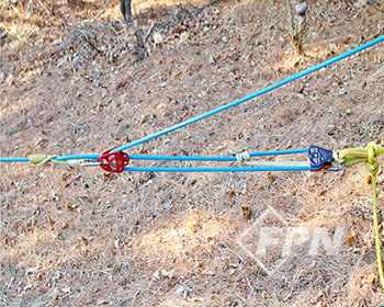 우리가 가진 장비가 부족하다면 당김줄의 중간 부분에 매듭을 만들어 로프를 잡아주는 슬링을 대체할 수 있고 카라비너를 이용해 도르래 역할을 할 수 있도록 알아봤다.