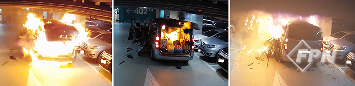 공개된 CCTV 영상을 보면 최초 폭발과 함께 시작된 불은 차량 내부에서부터 주차장 천장과 인근 차량으로까지 확산됐다. <FPN/소방방재신문> 취재 결과 스프링클러 등 소방시설이 갖춰진 최신 고가 아파트 단지라는 명색이 무색할 만큼 속수무책으로 번진 데에는 그만한 이유가 있었다.