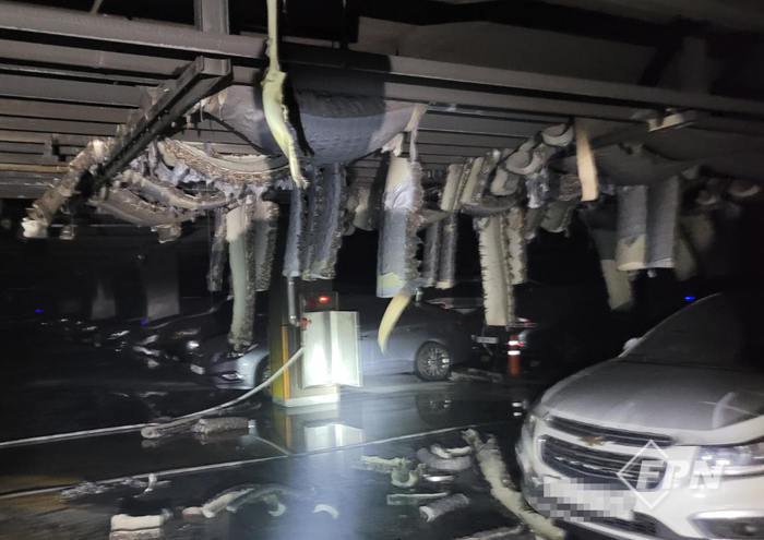 ![]() ▲ 화재가 발생한 주차장 천장에는 배관 보온재가 불에 탄 채 널부러져 있다. © 독자 제공 |