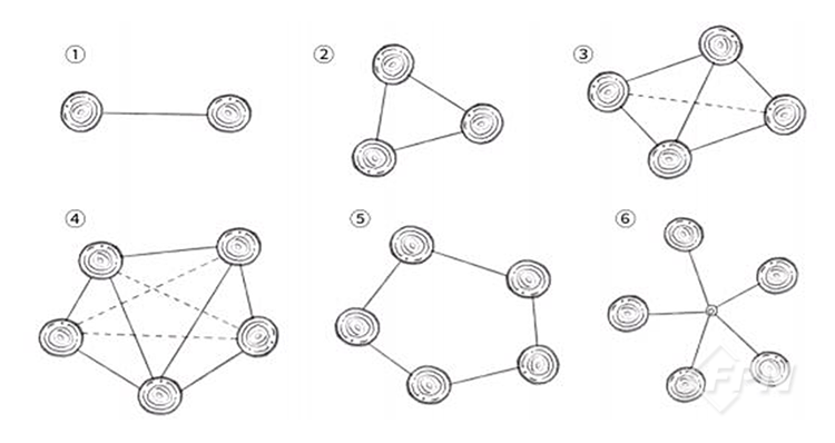 ① 직접연결 ② 삼각형 배치(세 모지/줄기) ③ 삼각형 배치(네 모지/줄기) ④ 삼각형 배치(다섯 모지/ 줄기) ⑤ 상자형 ⑥ 바큇살형