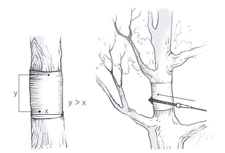 ㆍ마모 방지 싸개가 가지나 줄기를 감싸도록 위치시킨 후 다음과 같이 로프의 끝을 로프의 빈공간으로 삽입한 다음 마무리한다. - 로프 끝을 삽입하는 위치와 줄기 또는 가지의 거리는 해당 줄기나 가지 직경의 약 0.5배 정도 돼야 한다.