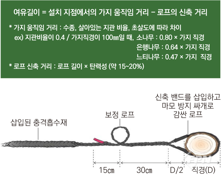 ㆍ가지의 움직임은 합성섬유 로프가 높은 탄력성(길이×15~20%)을 제공하기 때문에 로프는 추가적인 여유 없이 장력이 걸리지 않을 정도로 다소 느슨하게 설치한다.