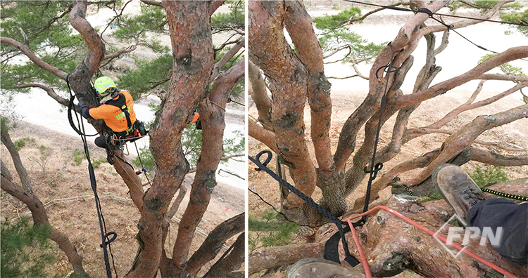ㆍ로프가 설치될 부위의 가지나 줄기를 감싸기 위해서는 - 수간 둘레 + 20㎝ 정도 길이의 신축 밴드(Expansion band)를 로프 내에 삽입하고 - 다시 수간 둘레에 해당하는 길이의 마모 방지 싸개(Abrasion sheath)로 로프를 감싼다.
