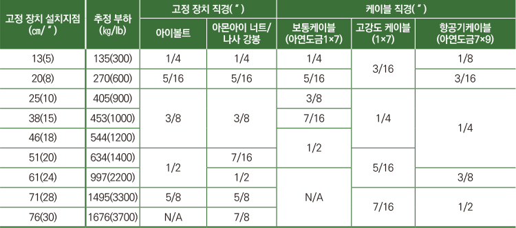 ㆍ보통 케이블은 가지 직경 61㎝부터는 사용이 불가하며 고강도 케이블이나 항공기 케이블을 사용하면 보다 가는 케이블로 지지력을 확보할 수 있다.