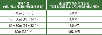 ㆍ설치 당시의 기부에서 측정한 가지의 직경이 80㎝를 초과하면 필요한 파괴강도를 별도로 측정해야 하는데 해당 파괴강도를 충족하는 자재가 없을 경우엔 가용한 자재를 둘 이상 결합해 설치할 수도 있다.