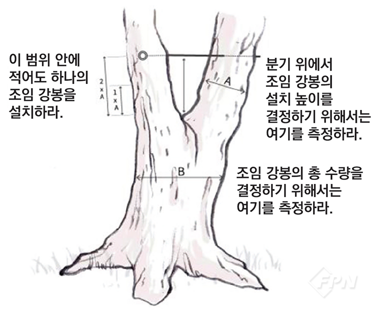 ㆍ설치될 조임 강봉의 수량은 분기 아래 간피융기선(Stem bark ridge)이 끝나는 지점에서 측정된 직경을 기준으로 결정한다.