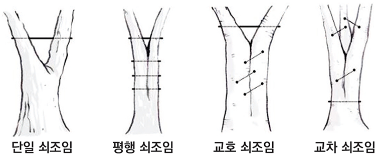 ㆍ단일 쇠조임 : 지지력이 가장 약하기 때문에 연결 부위에 찢어짐이 없는 직경 20㎝ 이하의 소교목에 적합한 유형이다.