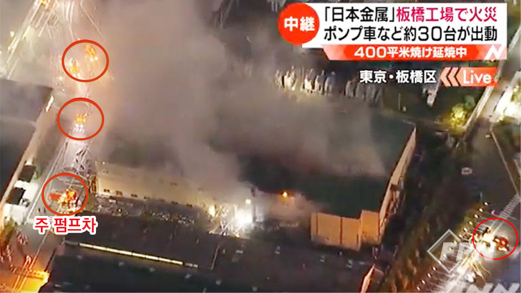 현장에서 목격할 수 있는 소방차는 단 4대다. 화재 현장 가장 가까이에 배치된 주펌프차에서 화재진압을 위한 관창 4구가 토출됐다. 뒤에 배치된 차량 2대는 주 펌프차에 가압 보수해 주고 있는 듯하다. 바로 일본 소방의 기본 전술이다.